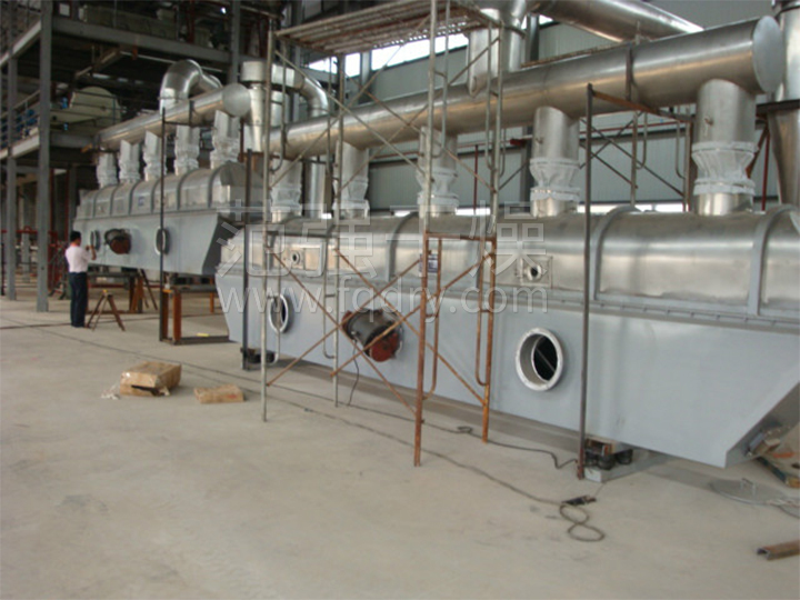 物料自進(jìn)料進(jìn)口進(jìn)入機內,在振動(dòng)力作用下,物料沿水平面流化床拋擲,向前連續運動(dòng),熱風(fēng)向上穿過(guò)流化床同濕物料換熱后,濕空氣經(jīng)旋風(fēng)分離器除塵后由排風(fēng)1:3排出.干燥物料由排料進(jìn)口排出。
