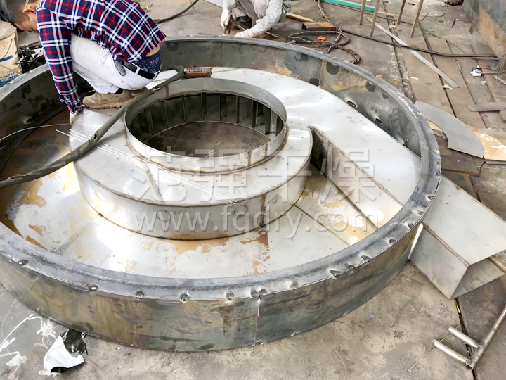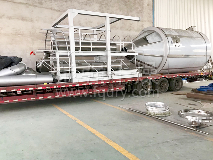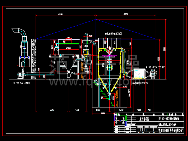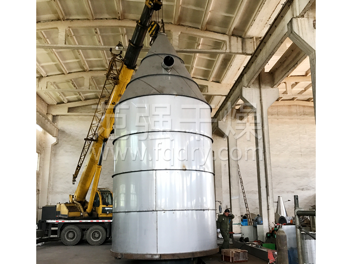 空氣經(jīng)過(guò)濾和加熱,進(jìn)入干燥器頂部空氣分配器,熱空氣呈螺旋狀均勻地進(jìn)入干燥室。料液經(jīng)離心噴霧干燥機塔體頂部的高速離心霧化器,(旋轉)噴霧成極細微的霧狀液珠,與熱空氣并流接觸在極短的時(shí)間內可干燥為成品。成品連續地由干燥塔底部和旋風(fēng)分離器中輸出,廢氣由風(fēng)機排空。