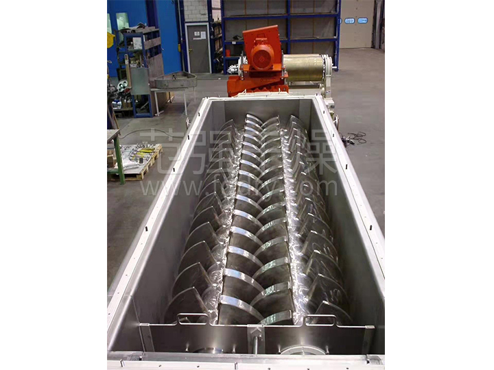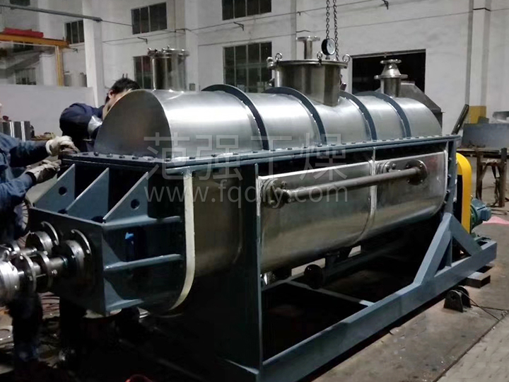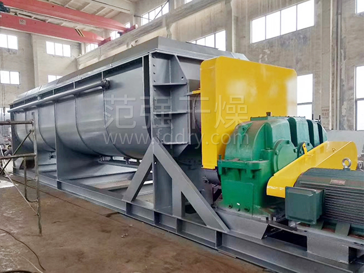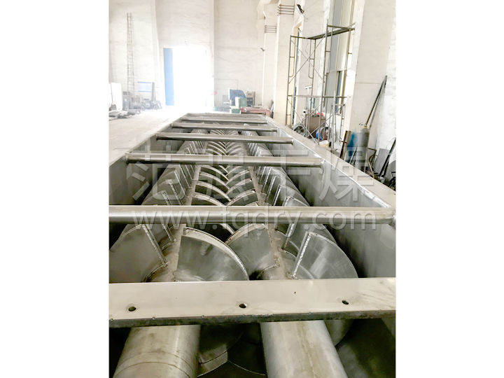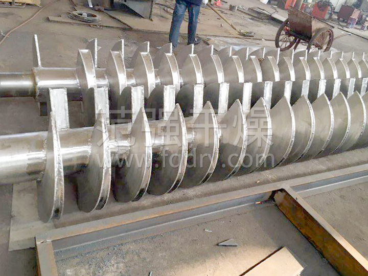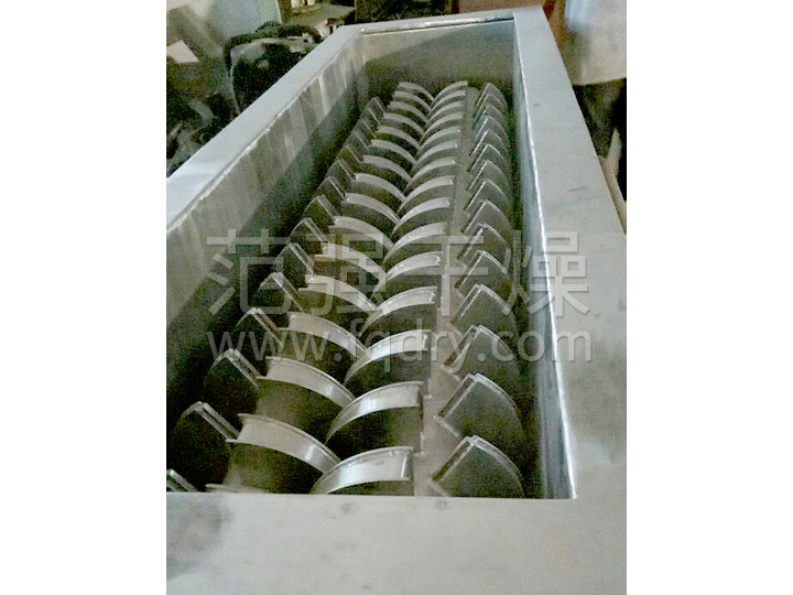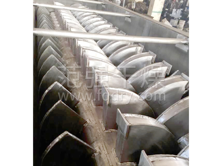 空心軸上密集排列著(zhù)楔型中空槳葉,熱介質(zhì)經(jīng)空心軸流經(jīng)槳葉。單位有效容積內傳熱面積很大,熱介質(zhì)溫度從-40℃到320℃,可以是水蒸汽,也可以是液體型:如熱水、導熱油等。間接傳導加熱,沒(méi)有攜帶空氣帶走熱量,熱量均用來(lái)加熱物料。熱量損失僅為通過(guò)器體保溫層向環(huán)境的散熱。楔型槳葉傳熱面具有自清潔功能。物料顆粒與楔型面的相對運動(dòng)產(chǎn)生洗刷作用,能夠洗刷掉楔型面上附著(zhù)物料,使運轉中一直保持著(zhù)清潔的傳熱面。槳葉干燥機的殼體為Ω型,殼體內一般安排二到四根空心攪拌軸。殼體有密封端蓋與上蓋,防止物料粉塵外泄而充分發(fā)揮作用。