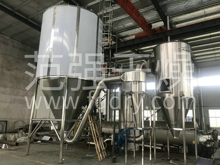 3、當干燥室進(jìn)口溫度達到設定溫度時(shí),開(kāi)啟離心噴頭,當噴霧頭達到最高轉速時(shí),開(kāi)啟進(jìn)料泵,加入清水噴霧10分鐘后更換成料液,進(jìn)料量應由小到大,否則將產(chǎn)生粘壁現象,直到調節到適當的要求。料液的濃度應根據物料干燥的性質(zhì)來(lái)配制,以保證干燥后成品有良好的流動(dòng)性。
