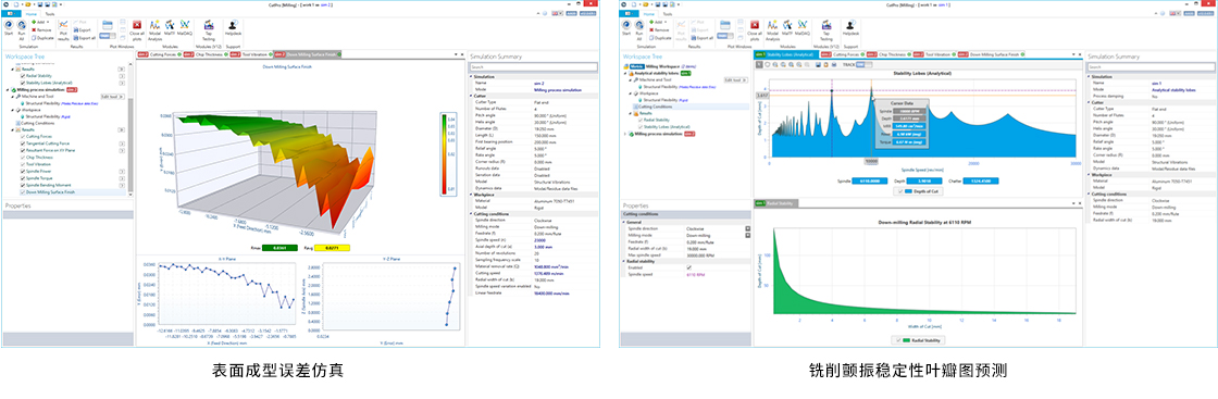 · 加工過(guò)程顫振穩定性預測,給出無(wú)顫振的主軸速度、進(jìn)給量和切削深度,以提高材料去除率,同時(shí)獲得良好的表面光潔度;
